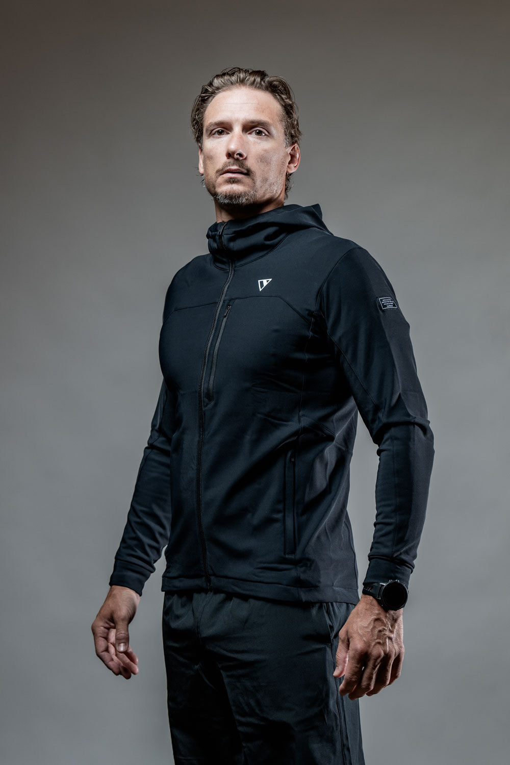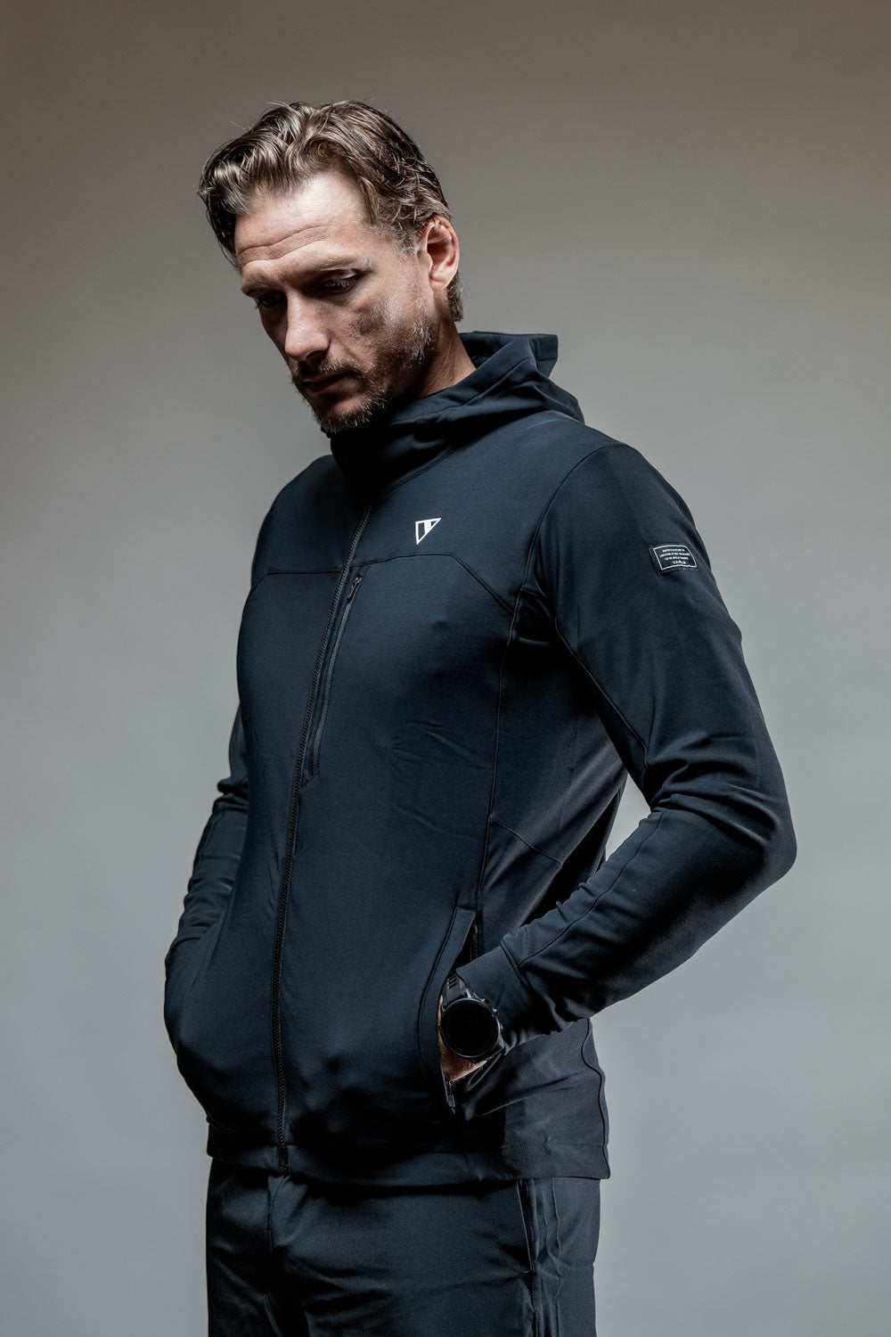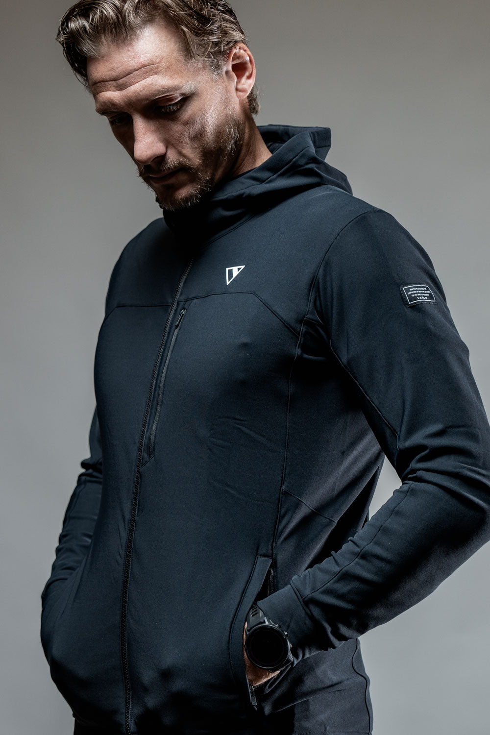 For added functionality, this jacket features two zippered side pockets for secure storage and a front chest zip pocket for easy access to essentials on the go.