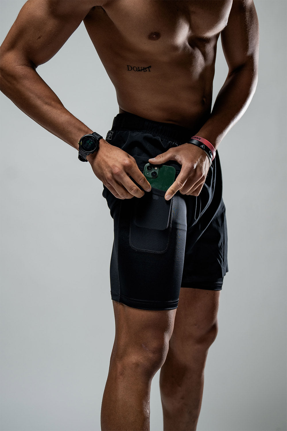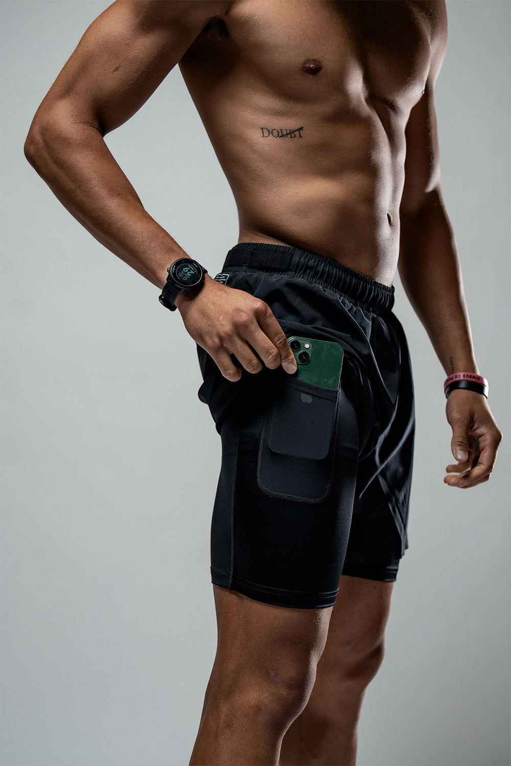 The integrated compression liner includes a secure pocket to hold your phone or training essentials, while a hidden back pocket offers space for keys, a wallet, or small valuables. Made with 4-way stretch performance fabric and antimicrobial properties, these shorts provide full freedom of movement while keeping you fresh, dry, and distraction-free.