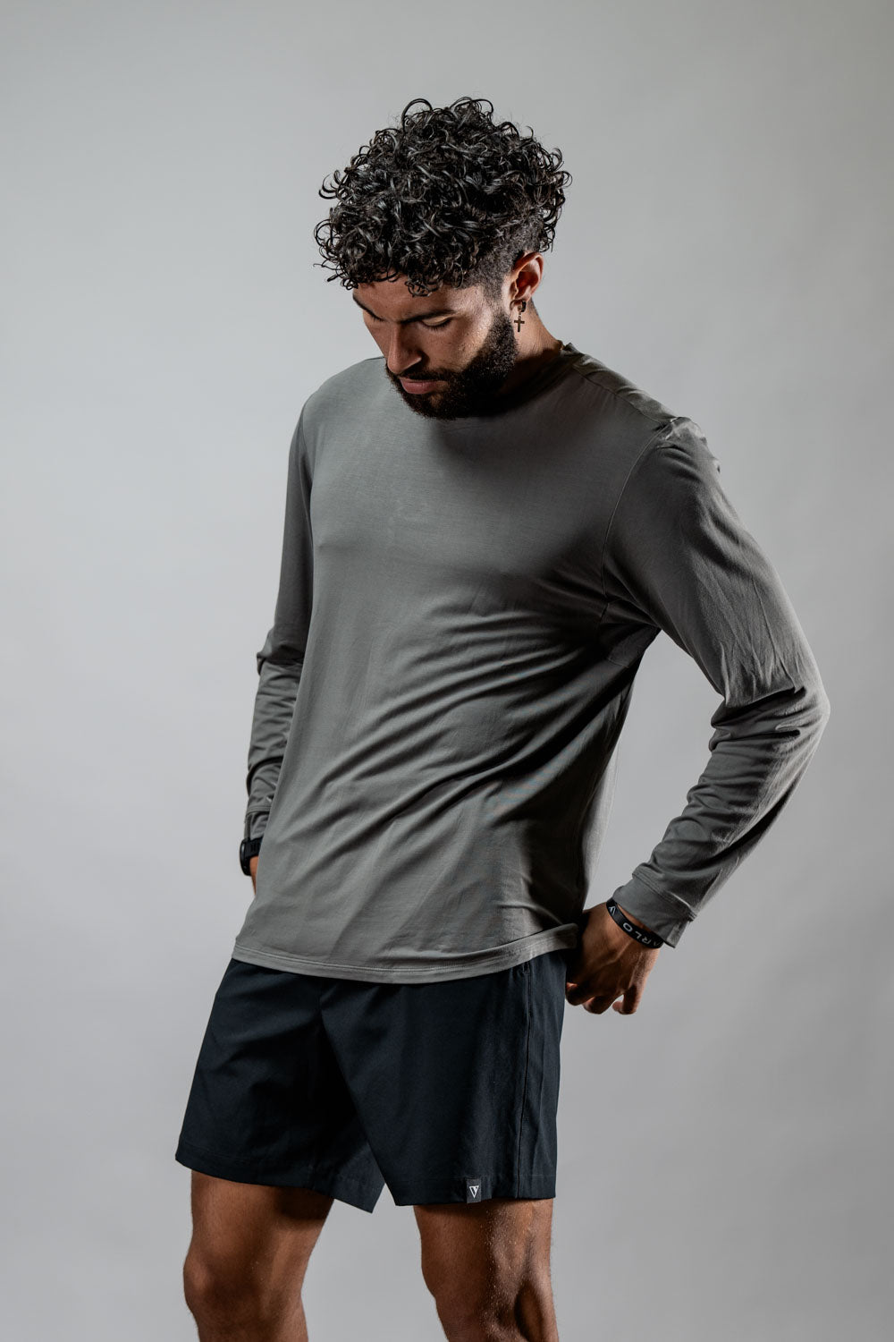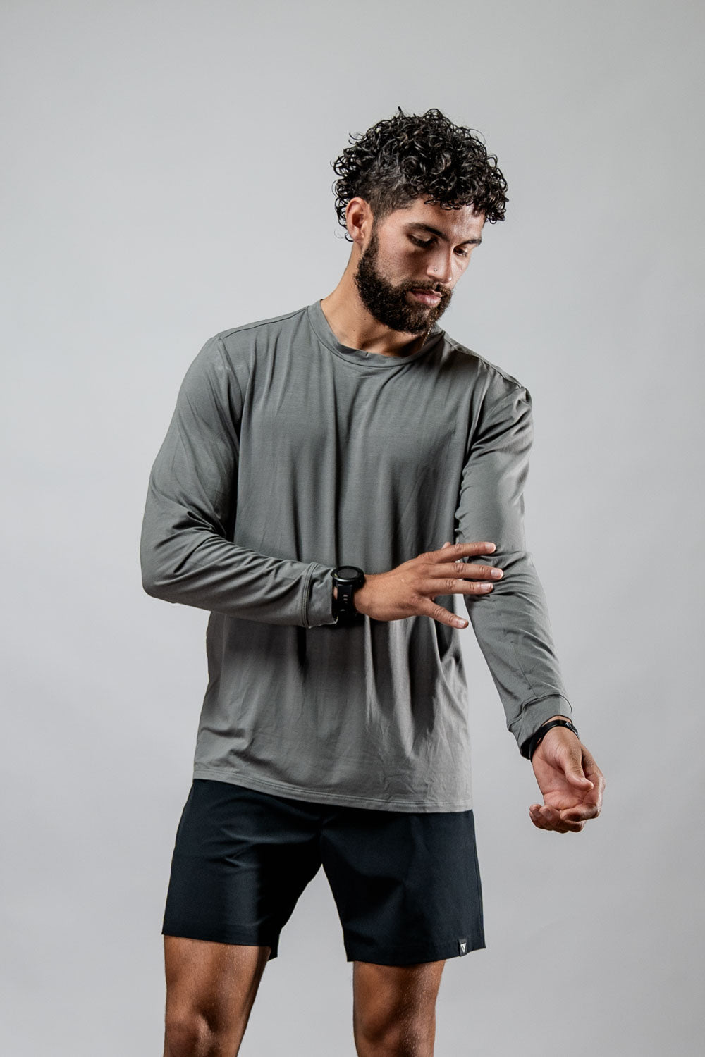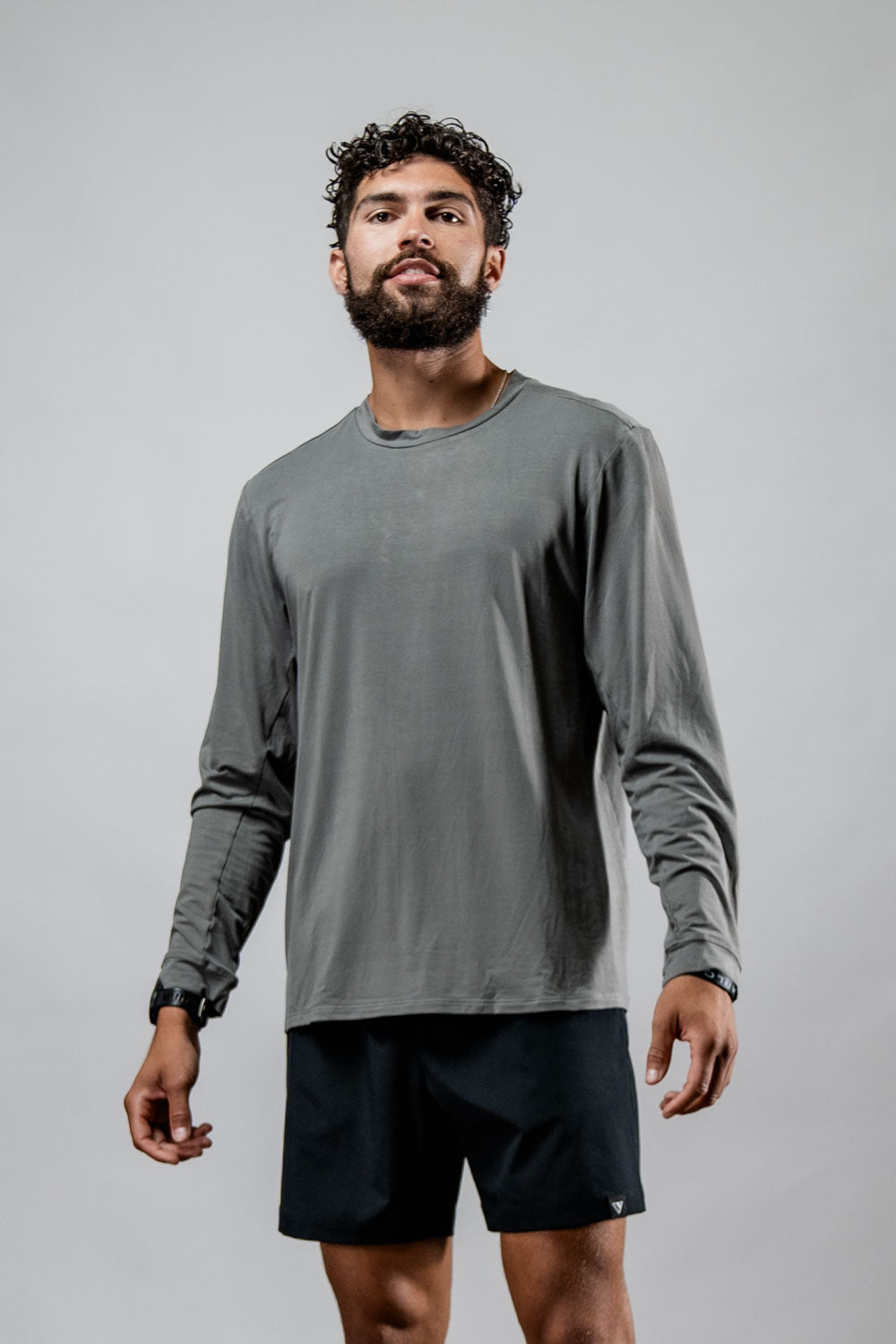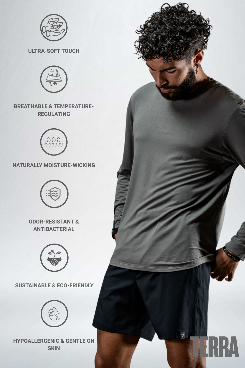 The Terra Field Shirt takes the timeless long-sleeve crewneck and elevates it with a sport-tailored fit designed for movement, comfort, and versatility. Built from our signature TerraFlex bamboo-blend fabric, it delivers the softness of a lifestyle tee with the performance benefits of training apparel — lightweight, breathable, and naturally stretchy.