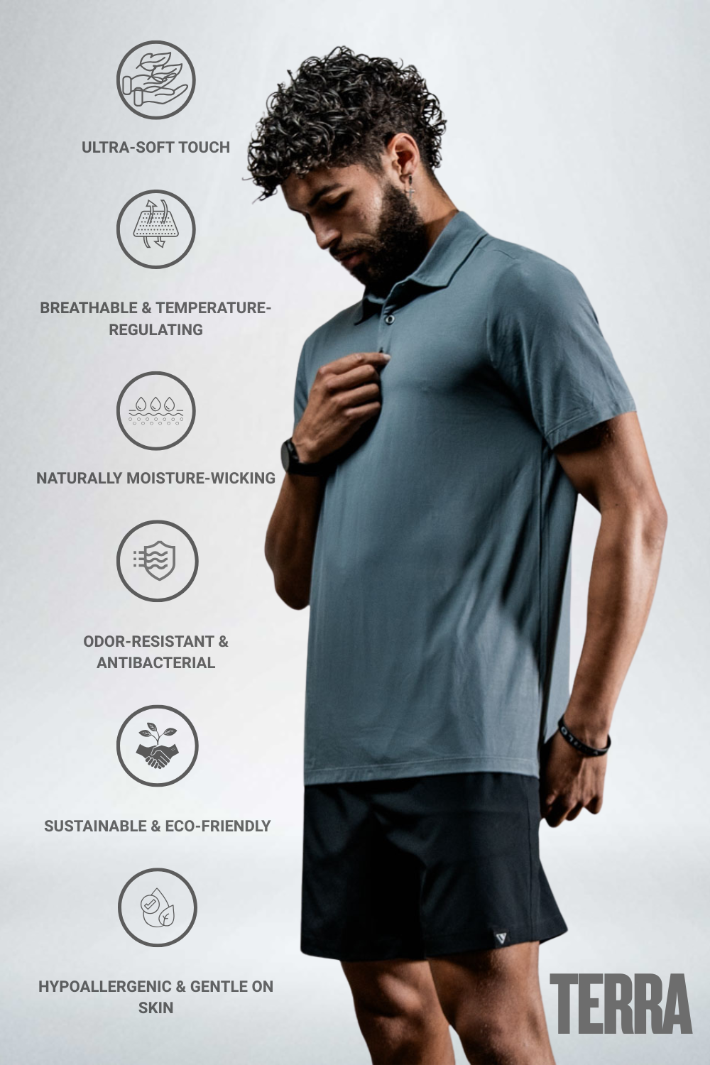 The Men’s Terra Polo redefines what a polo can be — merging technical performance with modern lifestyle design. Crafted from our TerraFlex bamboo-blend fabric, this polo delivers exceptional softness, breathability, and stretch, making it as functional in training as it is sharp for everyday wear.