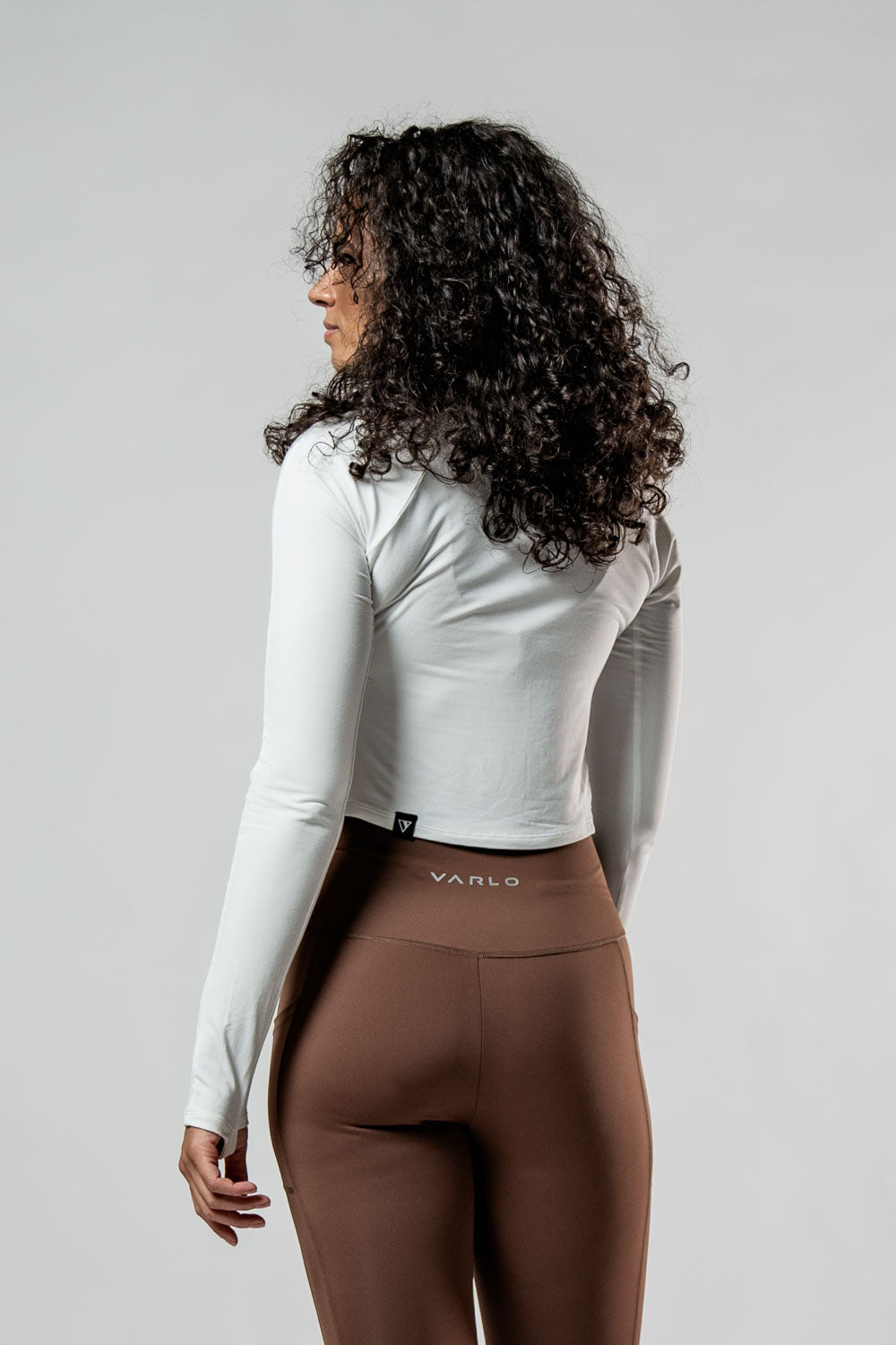 Featuring thumb holes for a secure fit and added warmth, and a wide collar neckline that enhances comfort and breathability, this piece brings a refined edge to your active lifestyle. The cropped silhouette offers a flattering, modern look that transitions seamlessly from studio to street.