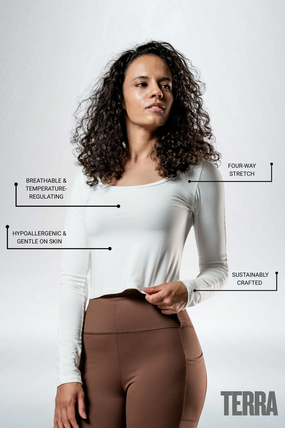 The Women’s Terra Long Sleeve Crop delivers the perfect balance of comfort, style, and performance. Made from our lightweight TerraFlex bamboo-blend fabric, it’s built to move with you — whether you’re training, recovering, or layering for the day ahead.